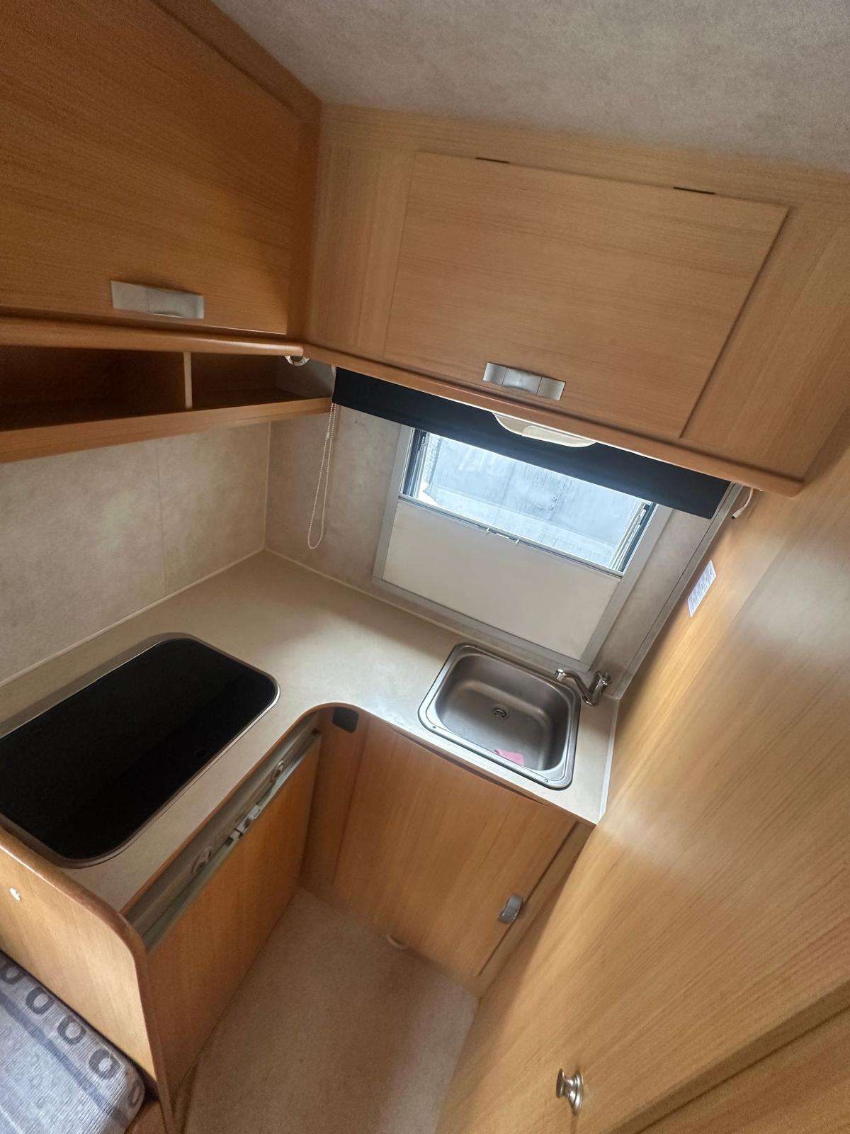 COCINA EQUIPADA: frigorífico trivalente 12 v – gas – 220 v, hornilla de 3 fuegos, fregadero.