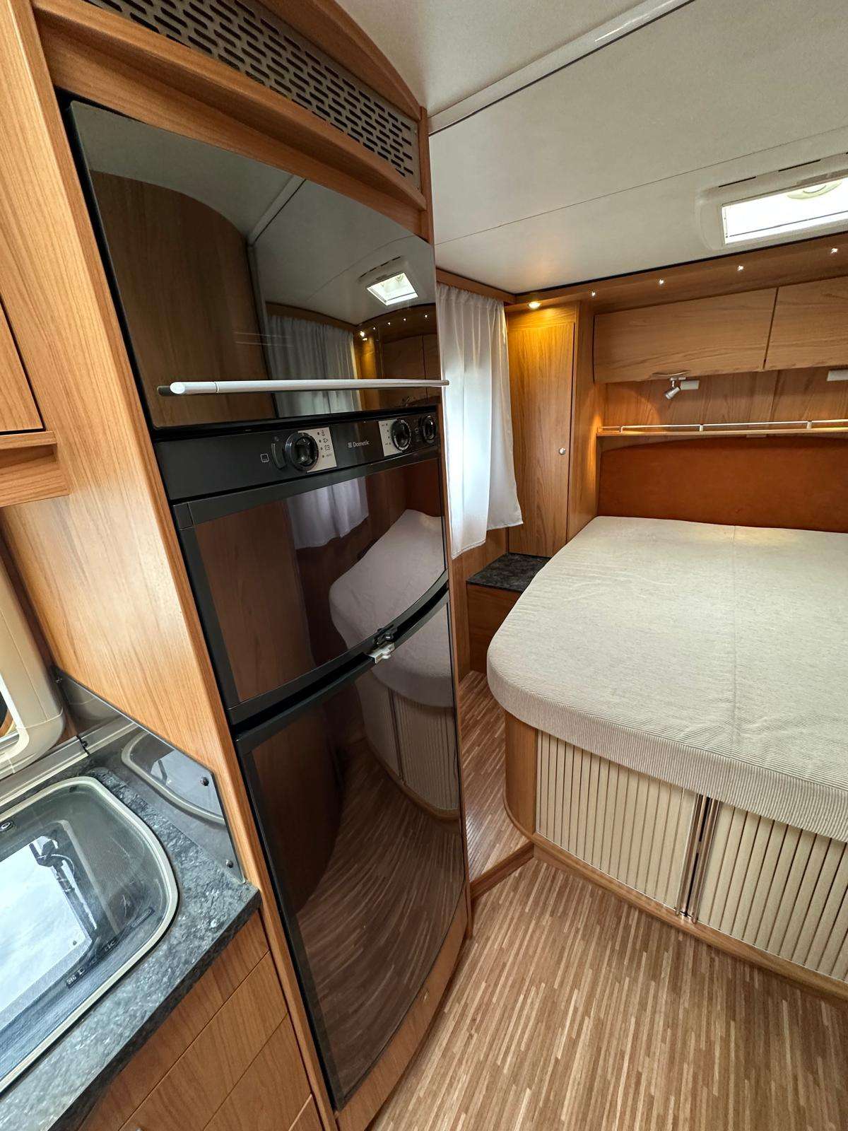 COCINA EQUIPADA: frigorífico grande trivalente 12v-gas-220 v, hornilla 3 fuegos,horno a gas, fregadero.