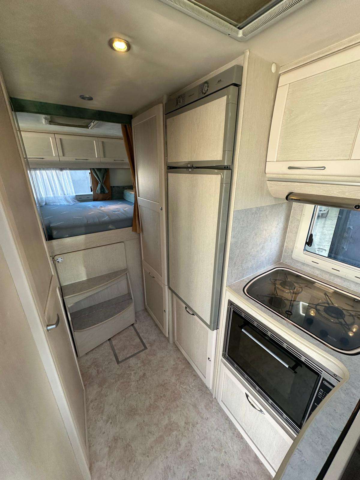 COCINA EQUIPADA: frigorífico grande    trivalente 12 v – gas – 220 v, hornilla de 3 fuegos, horno a gas,fregadero.