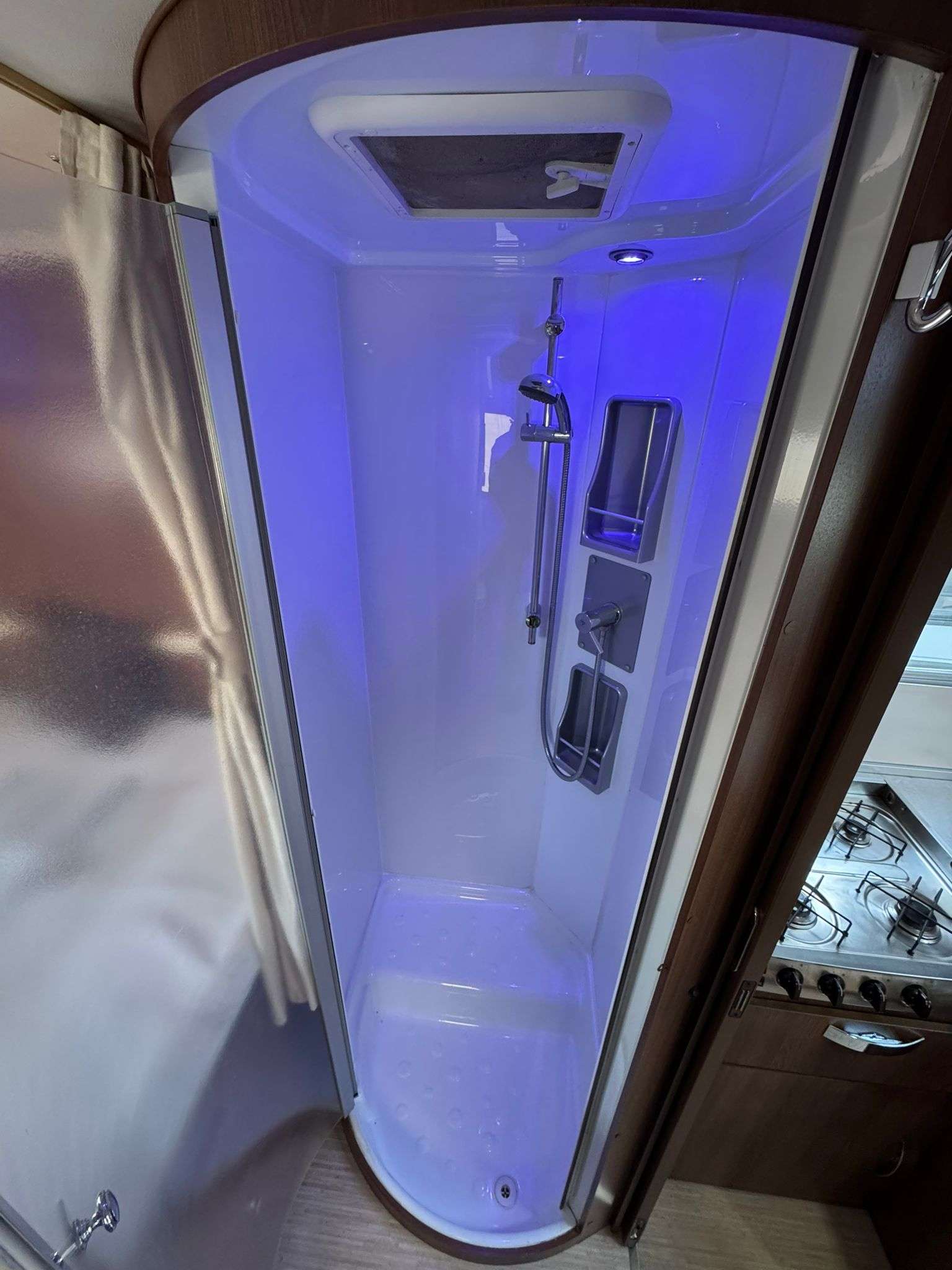 COCINA EQUIPADA: frigorífico grande trivalente 12v-gas-220 v, hornilla 4 fuegos,horno a gas,horno pizzero, fregadero.