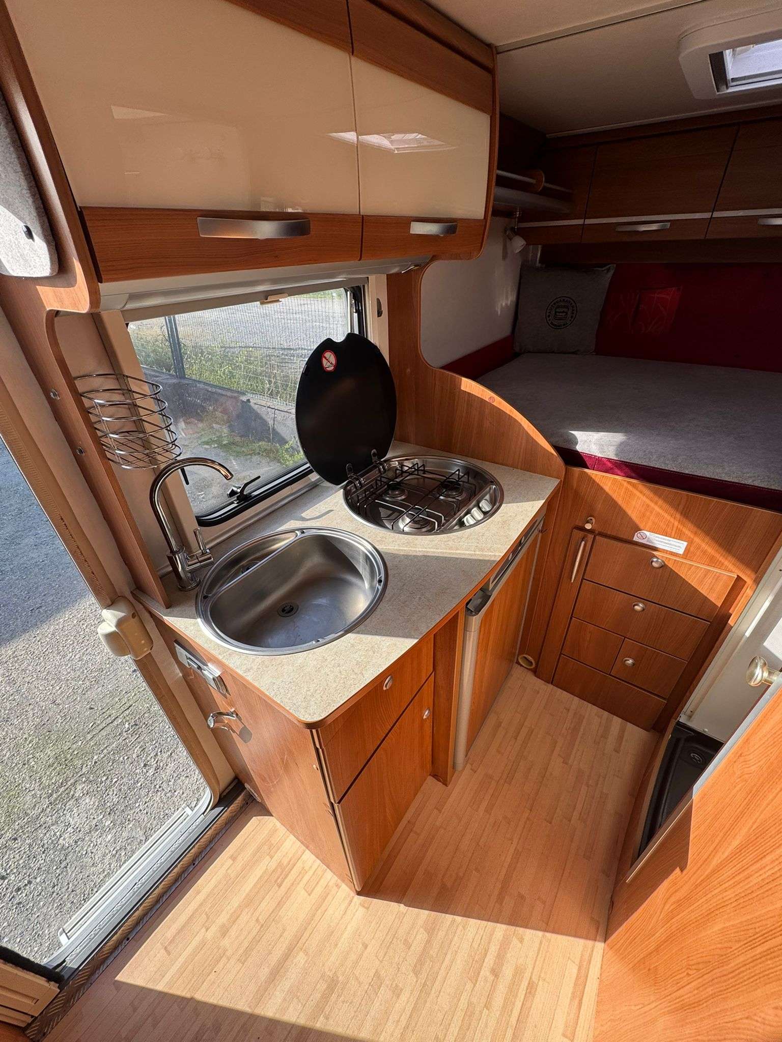 COCINA EQUIPADA: frigorífico trivalente 12 v – gas – 220 v, hornilla de 3 fuegos, fregadero.